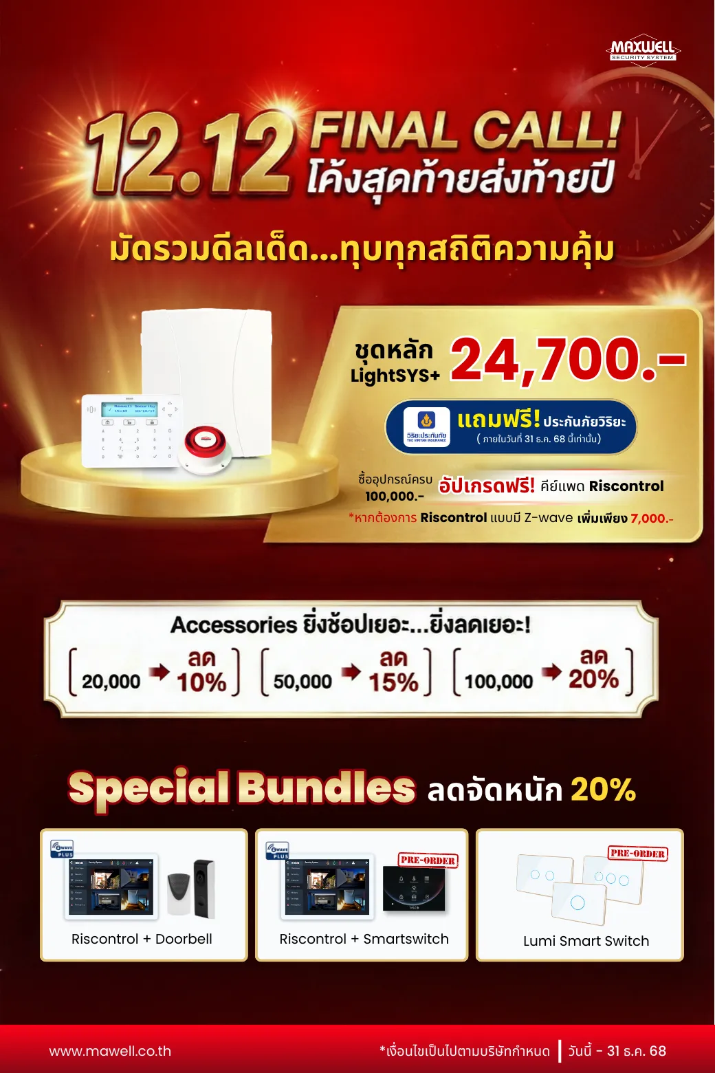 Maxwell Security System ส่งมอบความอุ่นใจในช่วงเทศกาลปีใหม่กับแคมเปญใหญ่ “12.12 FINAL CALL โค้งสุดท้ายส่งท้ายปี” มัดรวมดีลเด็ดที่คุ้มค่าที่สุด ทั้งส่วนลดและของแถมแบบจัดเต็ม สำหรับผู้ที่มองหาระบบสัญญาณกันขโมยและอุปกรณ์ Smart Home คุณภาพสูง