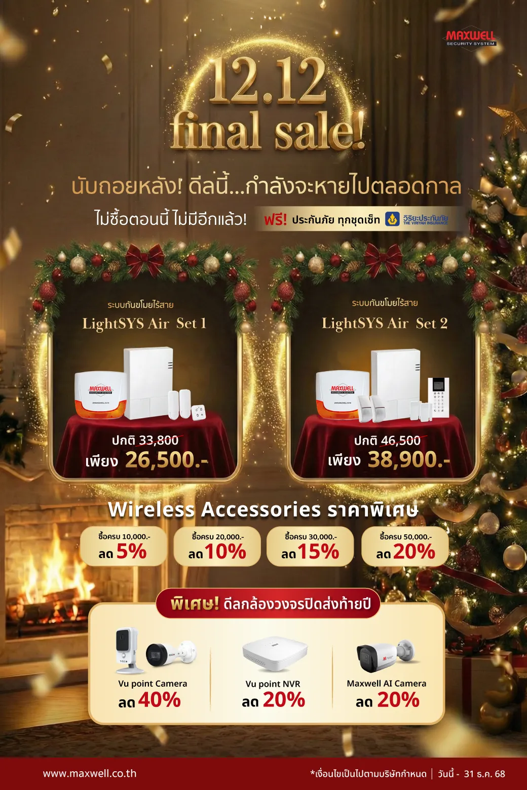 Maxwell Security System ประกาศเตือนโค้งสุดท้าย! กับแคมเปญ “12.12 Final Sale” โปรโมชั่นแรงส่งท้ายปีที่ไม่ควรพลาด โอกาสเดียวที่คุณจะได้เป็นเจ้าของระบบความปลอดภัยระดับพรีเมียมในราคาที่ดีที่สุด “ไม่ซื้อตอนนี้…ไม่มีอีกแล้ว!